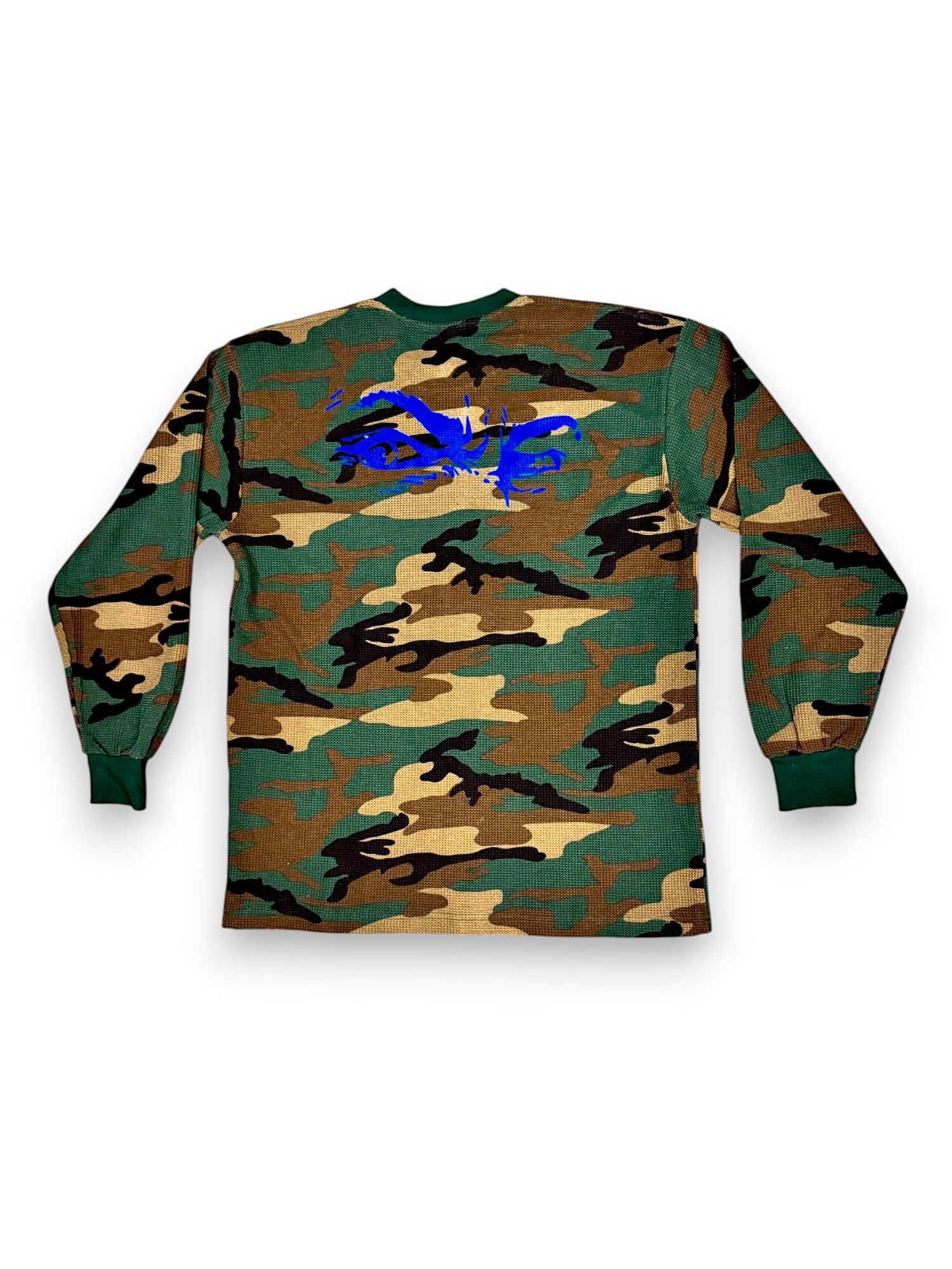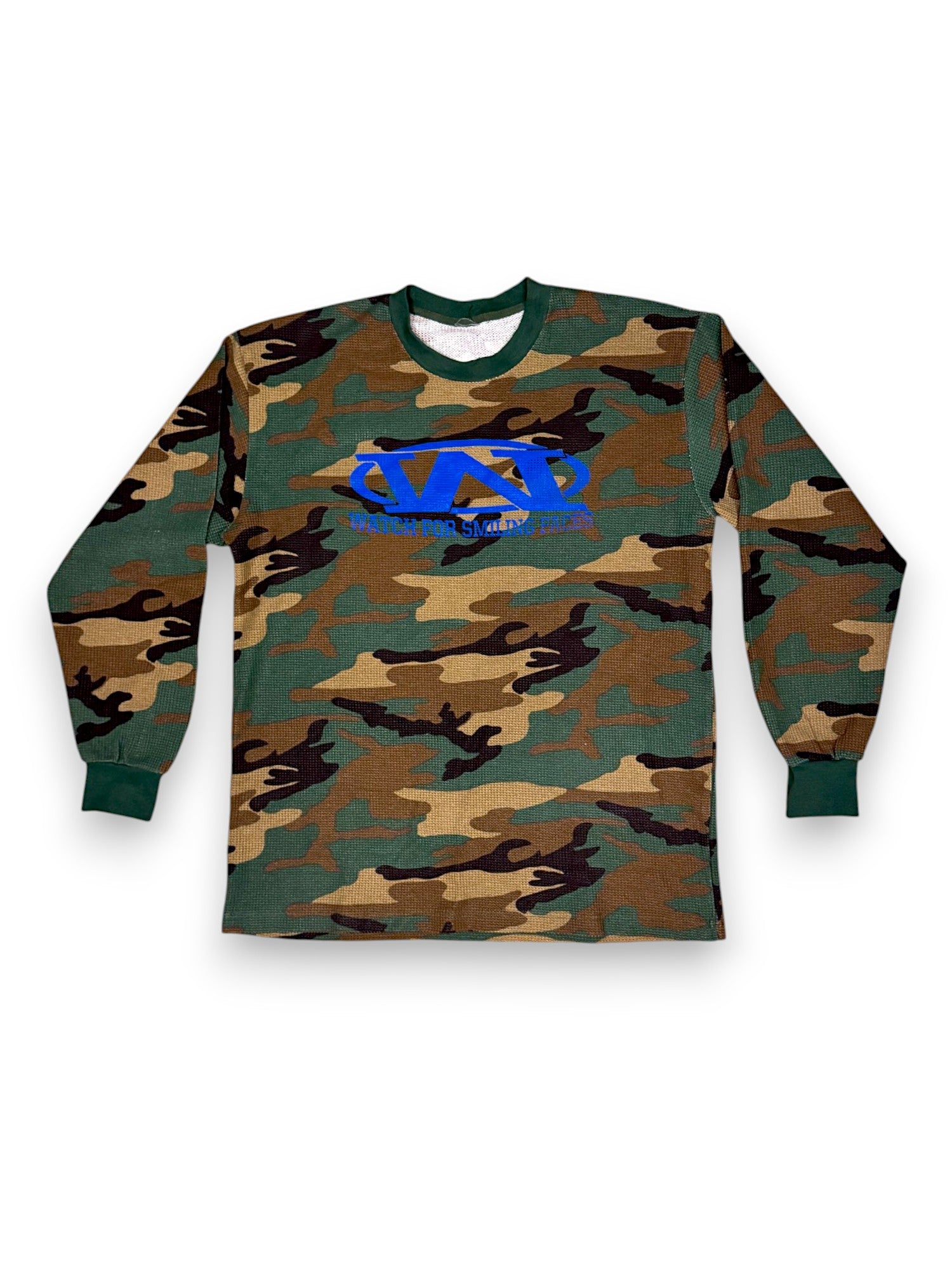A heavyweight thermal built for layered warmth and bold style. Cut from waffle-knit cotton for insulation and breathability. The all-over woodland camo print is paired with a bold front puff-print graphic in cobalt blue.